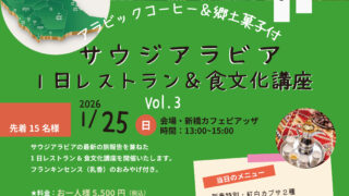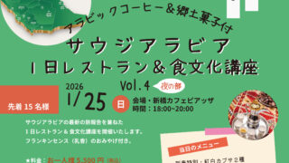 おかげさまでこちらのイベントはチケットが完売となりました。ありがとうございました。1/31(土)と2/1(日)開催の「サウジアラビアのお菓子たち&食文化講座」@港区麻布十番はまだ残席がございます。こちらでも同様にサウジの最新の旅報告をいたし...