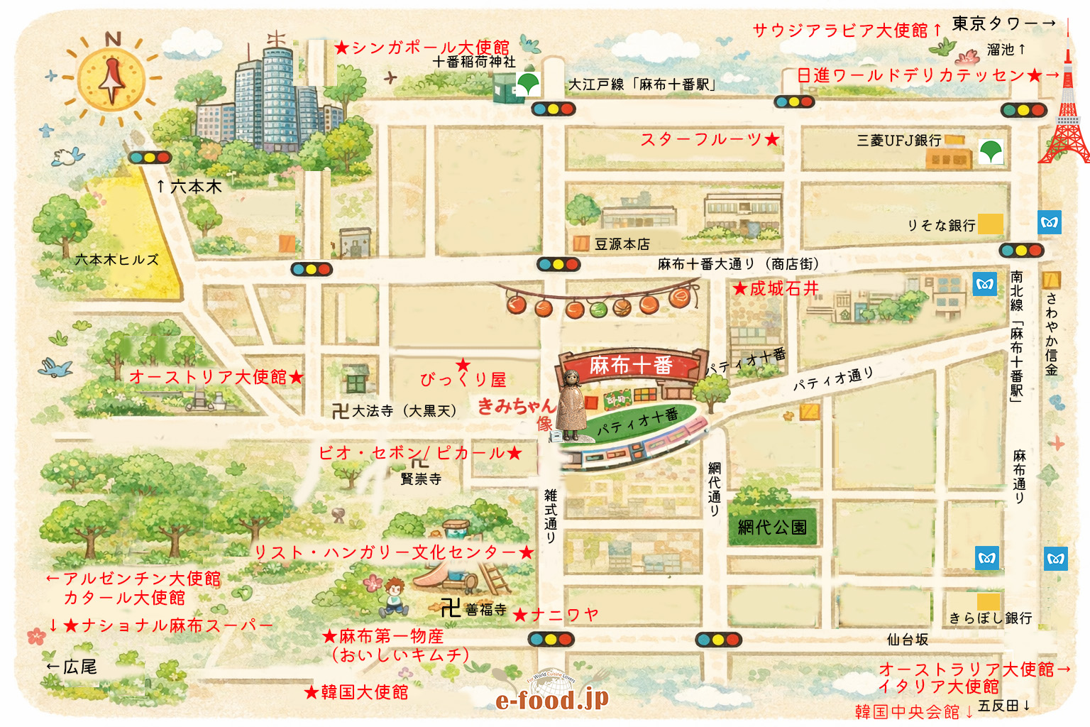 e-food.jpクッキングサロンのある東京都港区麻布十番の、食関連ショップや大使館、観光局マップ。