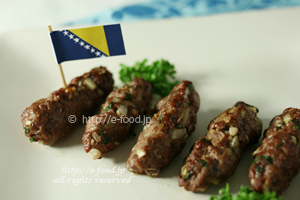 ボスニアの料理には、チェバプチチ(挽肉のグリル。ピタパンの中央を開いて挟み、生玉ねぎ、アイバルというパプリカのペーストを添えて食べる。上写真)、ブレク(挽肉・玉ねぎなどの詰め物を薄いパイ生地で細長く巻き鉄板で焼いた料理)のようにトルコの食文化の影響が見受けられます。