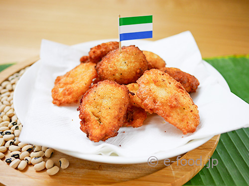 白い豆に黒のポイントの入ったパンダ豆(白黒豆)をつぶして揚げたビンチアカラも、西アフリカ諸国でポピュラーな料理。作り方は、中東の「ファラフェル」の西アフリカ版といってもよいでしょう。ビールのおつまみにも合うと思いますよ。