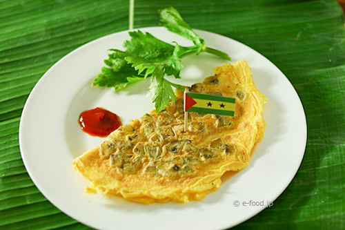 青バナナを使ったサントメ・プリンシペのバナナオムレツ(ポルトガル語でオメレータ・デ・バナナ)は、サントメ・プリンシペでは軽いランチや夕食として食べることが多いそう。青バナナがない場合はじゃがいもで代用できます。