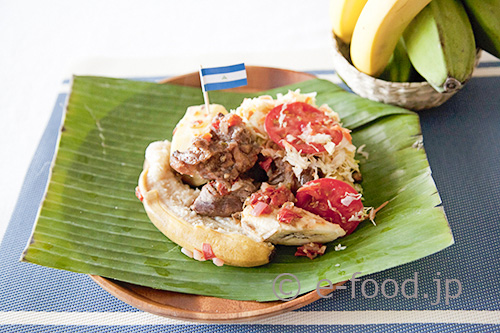 中米ニカラグア名物の蒸し料理。牛肉のマリネとバナナ、さつまいもなどをバナナの葉に包んで蒸し、リポロというキャベツの酢漬けを付け合せに食べます。