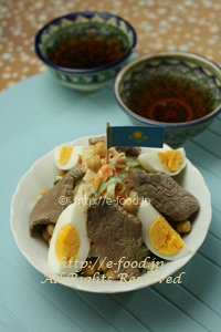 4.3をお皿に盛り、ゆでたまご、牛肉、ひよこ豆を飾る。