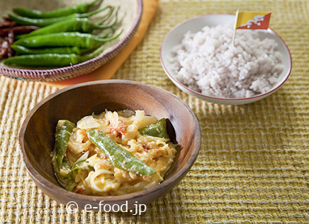 標高の高いブータンでは、体を温めるために、とうがらしを多用した料理がポピュラー。誰が言ったか「世界一辛い料理」と称されることも。このケワ・ダツィ(とうがらしとチーズの煮込み)も、シンプルな調理法ながら、そんなブータンらしい料理のひとつといえそうです。