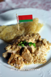 豚肉をサワークリームで煮て、パンケーキを添えたマチャンカは、ベラルーシを代表する料理のひとつ。