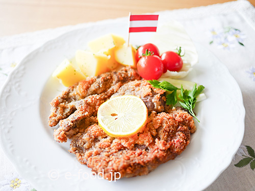 薄切りした仔牛肉を叩きながら伸ばして揚げたウィーン風カツレツ=ウィンナー(ヴィーナー)・シュニッツェルは、ウィーンでは伝統的にゆでたじゃがいもとレモンのスライスを添えていただきます。