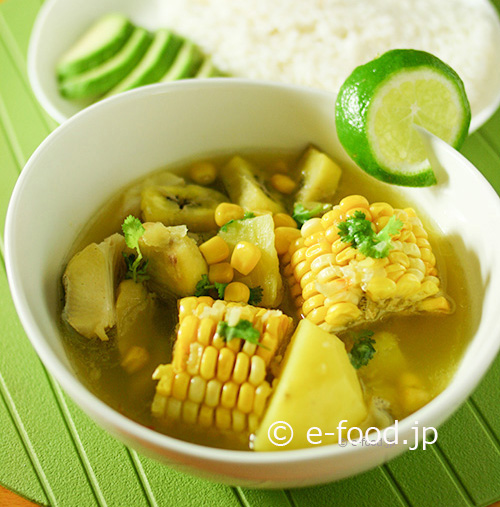サンコーチョは、中南米のカリブ沿岸諸国でポピュラーな、魚またはチキンと野菜をじっくり煮込んだスープ。コロンビアでは、輪切りのとうもろこしをまるごと入れます。見栄えもよく、いっそうおいしそうに見えますよ。