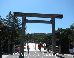 - 伊勢神宮・内宮前の大鳥居。赤福本店は、内宮近くに栄えるおはらい町の中にある。