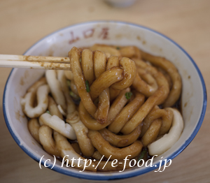 ん?やっぱりコシがない。でも待てよ。ふにゃふにゃといっても、かつてトラウマになった給食のソフト麺(年がバレますが…)とは違い、しっかりとかみ心地があって、小麦粉の風味もちゃんとする。これって、いわゆるうどんというより、すいとんに近いのでは?たまり醤油ベースのつゆも、色に似合わず、だしが効いていて塩辛いわけではないし。