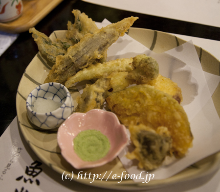 - 金沢市内の料亭で出された、加賀野菜を使った天ぷら。金時草、さつまいもの五郎島金時、みょうがなどの盛り合わせ。抹茶塩とともに。