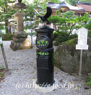 - 熊野の大神(素盞鳴尊)にお仕えするといわれる、八咫烏(やたがらす)の郵便ポスト。投函すると、本当に郵便を配達してくれる。