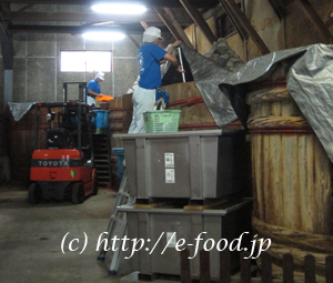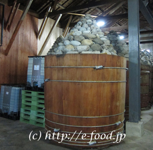 - まるやさんの蔵の中。代々使われてきた川石を重石に使っている。